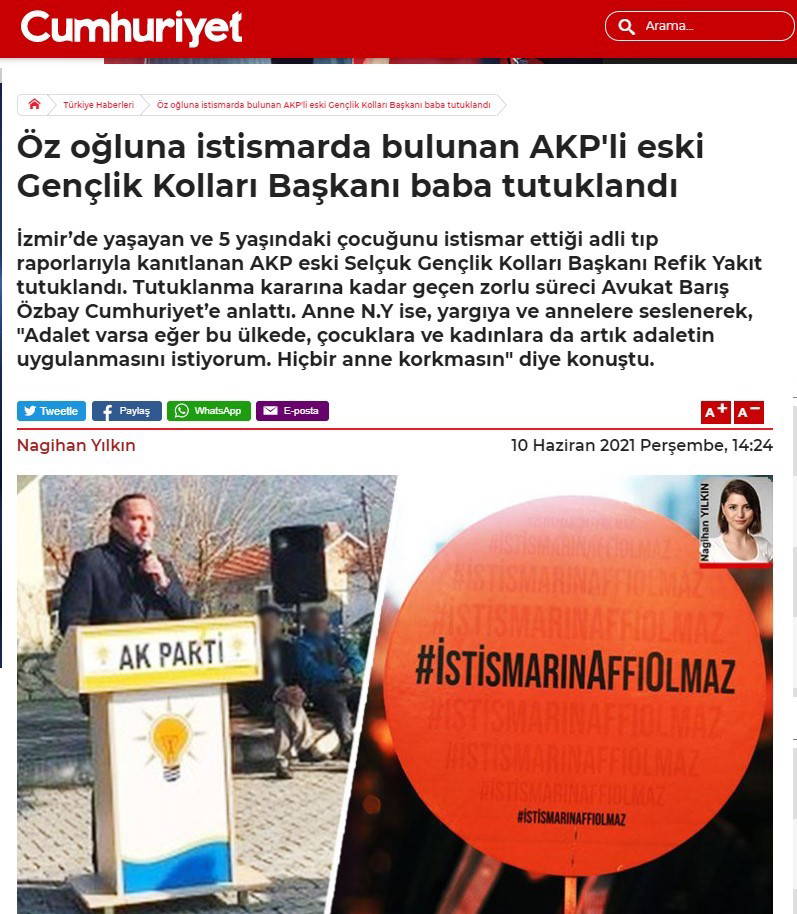 İzmir’de yaşayan, 2 ve 5 yaşlarında iki erkek çocuk sahibi AKP eski Selçuk Gençlik Kolları Başkanı Refik Yakıt'ın öz çocuğuna cinsel istismarda bulunduğu adli tıp raporlarıyla kanıtlandı. Şahıs hakkında yakalama kararı çıkarılmış ve Selçuk Sulh Ceza Hakimliği tarafından tutuklanmıştı.
