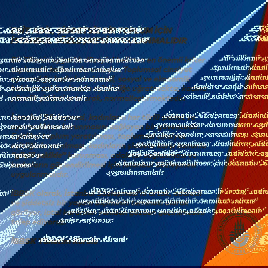 İstanbul BBSK twitter üzerinden yayınladığı açıklamasında "Eşit, adil, şiddetsiz bir toplum için İstanbul Sözleşmesi uygulanmalıdır" açıklamasını yaptı.
