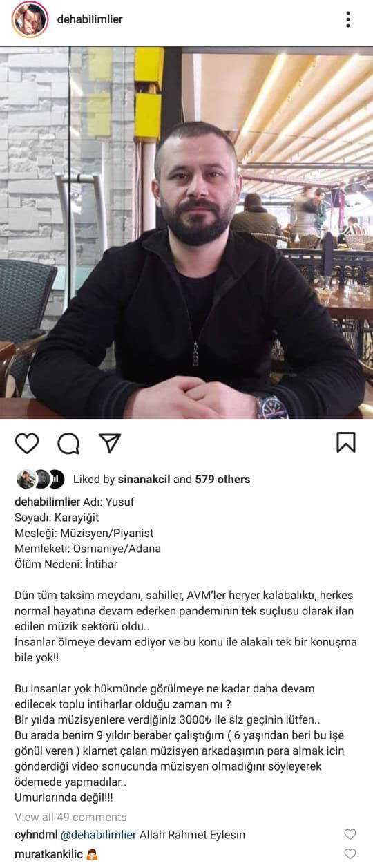 Bu kez Osmaniye’de Yusuf Karayiğit isimli genç bir müzisyen yaşamına son verdi. Konuyu sosyal medya hesabından paylaşan şarkıcı Deha Bilimlier ise pandemi önlemlerinde yapılan adaletsizliği dile getirdi.