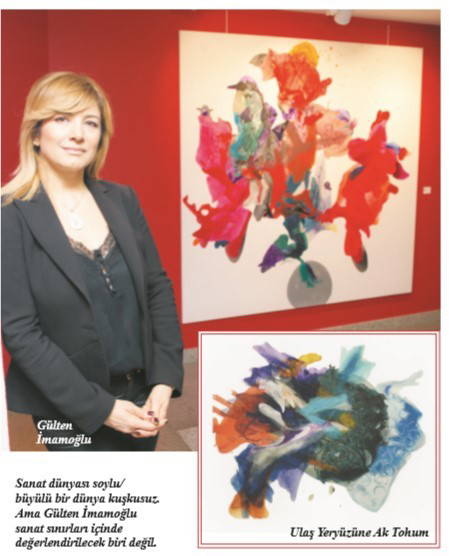 Sanat dünyası soylu/büyülü bir dünya kuşkusuz. Ama Gülten İmamoğlu sanat sınırları içinde değerlendirilecek biri değil. O aldırmıyordur belki ama uluslararası başarılar kazanmış çalışmalarının toplumumuzda hak ettiği ilgiyi gördüğü iddia edilemez. Görünürlük açısından asla kıyas kabul etmez bir durumdur kuşkusuz ancak “et tuzlama”yla uluslararası ilgi toplayan figürlerin olduğu yerde muhteşem sanatıyla toplumunun dışa açık gerçek yüzü olduğunun fark edilmemesi çok acıdır. Oysa dünyanın herhangi bir yerinde herhangi biri, İmamoğlu’nun eserlerinden esinlenerek tasarımlar yapan dünyaca ünlü moda tasarımcısı Juan Carlos’un takılarını kullanıyor. Donald Trump’ın, tam dokuz eserinin haklarını satın alması da dünya resim piyasasında kendisine verilen önemin maddi açıdan işareti sayılmalıdır.