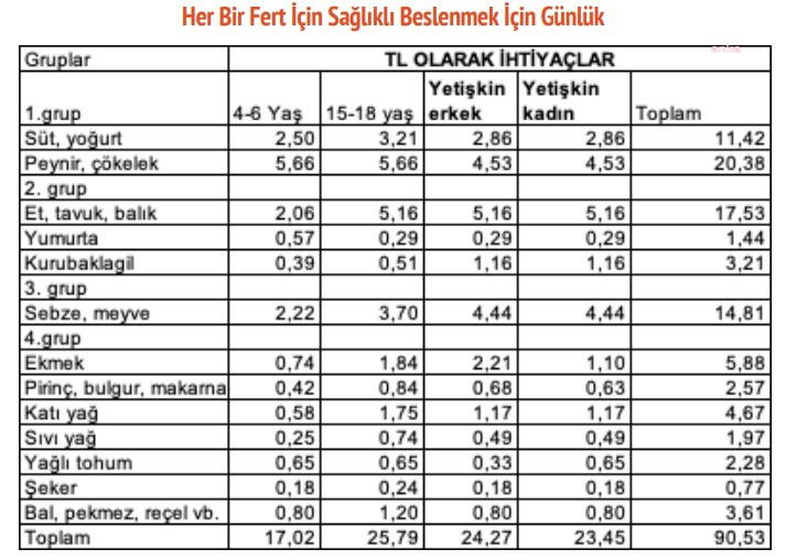 2003 yılının mart ayında 4 kişilik bir aile, günlük minimum 13.9 TL’ye sağlıklı beslenebilirken, bugün ancak 90.53 TL’ye sağlıklı beslenebilmektedir. Buna göre 18 yıllık zaman zarfında açlık sınırı 6.51 kat arttı. Aynı dönemde enflasyondaki artış ise 5.44 kat oldu. Açlık sınırındaki artış genel enflasyonda yaşanan artıştan daha fazla oldu. Buna göre yetişkin bir kadının sağlıklı beslenmesi için yapması gereken günlük harcama tutarı 23.45 TL, yetişkin bir erkeğin 24.27 TL, 15-18 yaş arası bir gencin 25.79 TL, 4-6 yaş arası bir çocuğun ise 17.02 TL'dir.