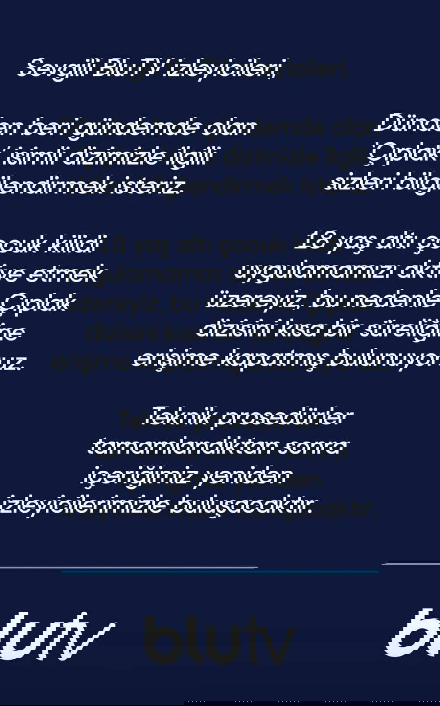Yapılan açıklamada "18 yaş altı çocuk kilidi uygulamamızı aktive etmeyi planladığımız bir dönemde olduğumuz için Çıplak dizisini kısa bir süreliğine erişime kapatmış bulunuyoruz. Teknik prosedürler tamamlandıktan sonra içeriğimiz yeniden izleyicilerimizle buluşacaktır" ifadeleri kullanıldı.