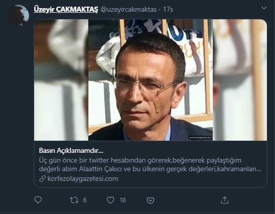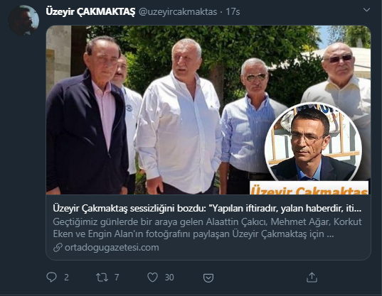 “Üç gün önce bir Twitter hesabından görerek, beğenerek paylaştığım değerli abim Alaattin Çakıcı ve bu ülkenin gerçek değerleri, kahramanları Mehmet Ağar, Engin Alan ve Korkut Eken’in bir arada olduğu fotoğraf bir anda Türkiye gündeminde lehte-aleyhte yankı uyandırdı. Fotoğrafı ilk paylaşan ben değildim, ancak medya ve sosyal medya benim paylaşımımı esas alarak servis ettiler.”
