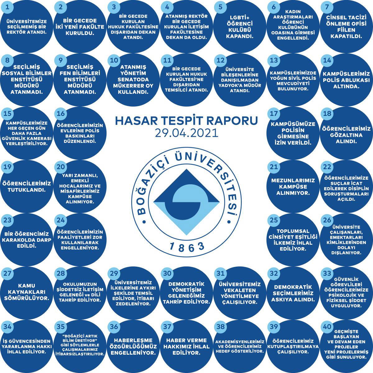 AKP'li Melih Bulu2nun Boğaziçi Üniversitesi'ne rektör olarak atanmasının ardından akademisyen, memur ve öğrencilerin başlattığı protestolar sürüyor. Boğaziçi akademisyenleri, hazırladıkları 40 maddelik hasar raporunu sosyal medyadan paylaştı. Başlatılan kampanya kapsamında 40 madde, sosyal medya platformlarından paylaşıldı.