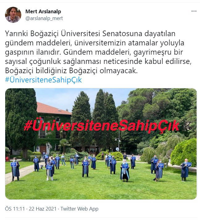 Seçilmiş senatörlerin toplantıyı terk etmesiyle ertelenen ve bugün gerçekleştirilecek olan Boğaziçi Üniversitesi Senato toplantısı öncesi akademisyenler, #ÜniversiteneSahipÇık etiketi ile atanmış yönetiminin, tüm üniversiteyi ilgilendiren kararları gerçek bir temsiliyet olmadan almaya çalışmasını eleştirdi.