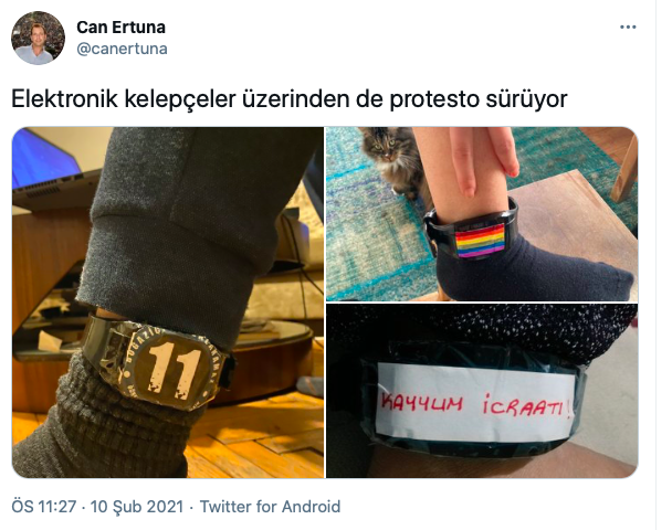 Gazeteci Can Ertuna da Twitter hesabından "Elektronik kelepçeler üzerinden de protestolar sürüyor" diyerek öğrencilerin fotoğraflarını paylaştı.