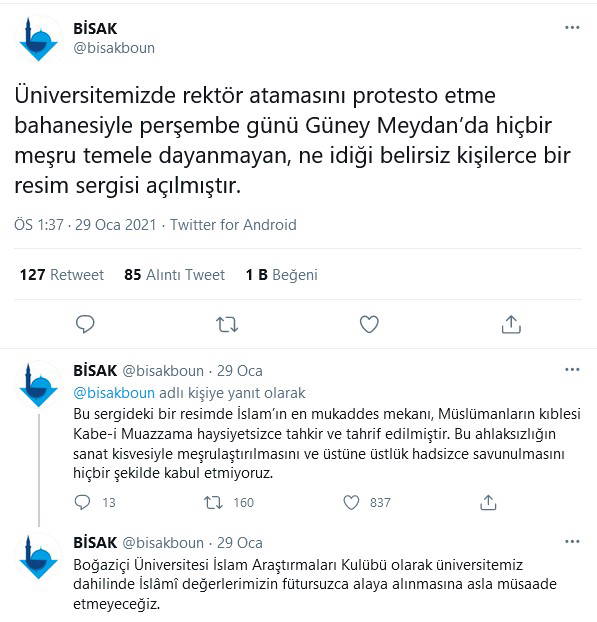 Kulüp, Twitter hesabından yaptığı açıklamada, "Boğaziçi Üniversiteleri İslam Araştırmaları Kulübü olarak üniversitemiz dahilinde İslami değerlerimizin fütursuzca alaya alınmasına müsaade etmeyeceğiz" ifadelerini kullandı.