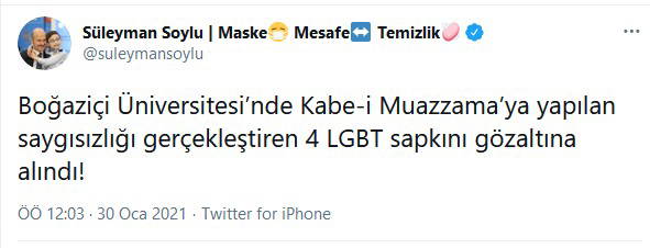 İçişleri Bakanı Süleyman Soylu, konu hakkında Twitter hesabından yaptığı açıklamada, "Boğaziçi Üniversitesi’nde Kabe-i Muazzama’ya yapılan saygısızlığı gerçekleştiren 4 LGBT sapkını gözaltına alındı!" ifadelerini kullandı.