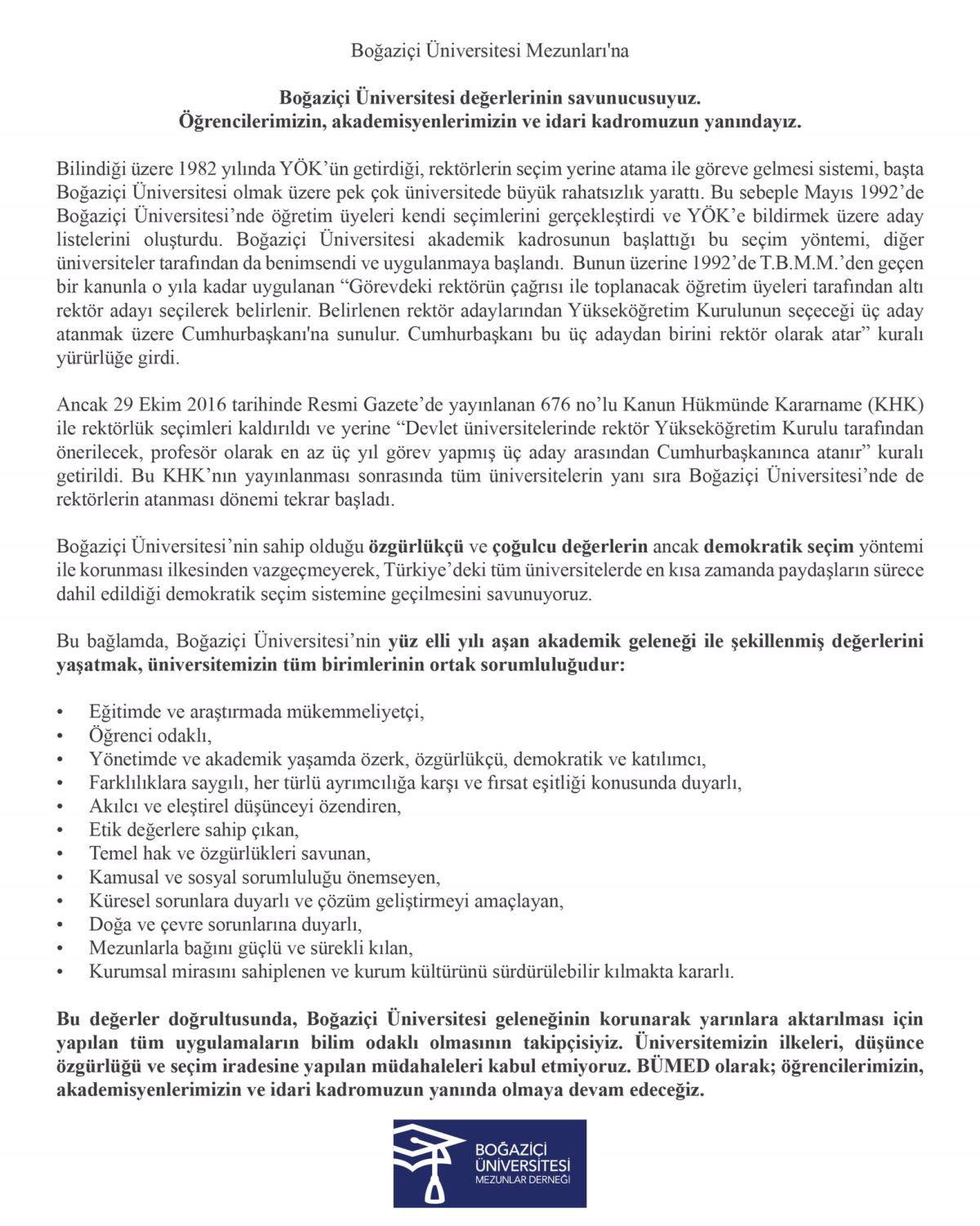 Boğaziçi Üniversitesi’nin sahip olduğu özgürlükçü ve çoğulcu değerlerin ancak demokratik seçim yöntemi ile korunması ilkesinden vazgeçmeyerek, Türkiye’deki tüm üniversitelerde en kısa zamanda paydaşların sürece dahil edildiği demokratik seçim sistemine geçilmesini savunuyoruz.