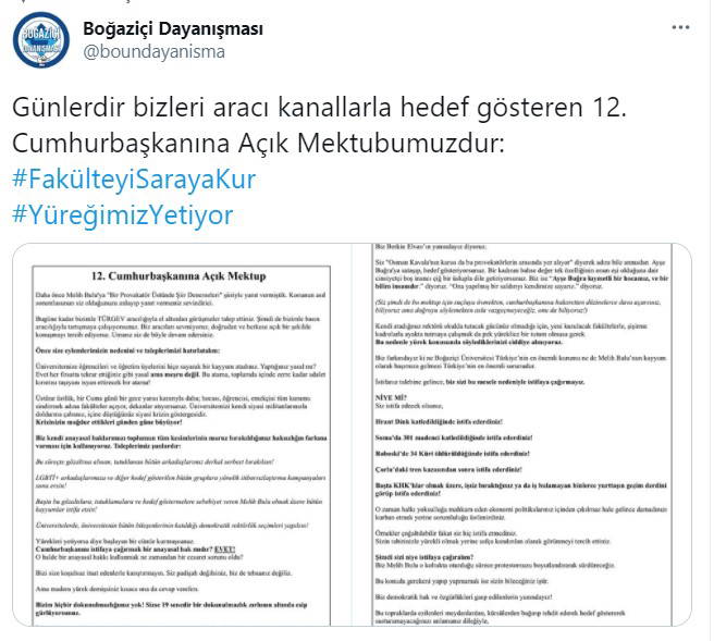 Boğaziçi Dayanışması’nın Twitter hesabından, "Günlerdir bizleri aracı kanallarla hedef gösteren 12. Cumhurbaşkanına Açık Mektubumuzdur" ifadeleriyle paylaşılan mektupta Erdoğan'a "Siz padişah değilsiniz, biz de tebaanız değiliz" hatırlatması yapıldı.