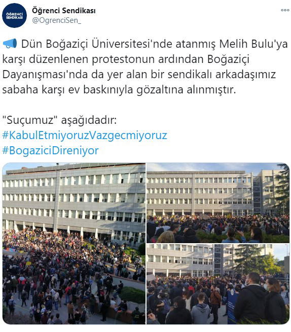 Öğrenci Sendikası da 1 üyelerinin gözaltına alındığını duyurdu.