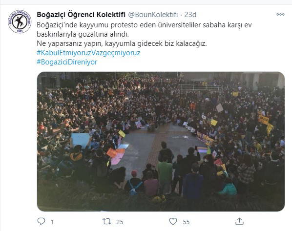 Öğrenci Kolektifleri'nden yapılan açıklamada, 4 üyelerinin gözaltına alındığı belirtilerek, "Boğaziçi'nde kayyumu protesto eden üniversiteliler sabaha karşı ev baskınlarıyla gözaltına alındı.