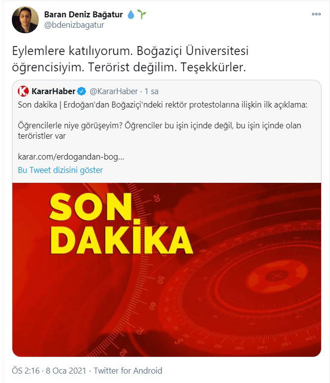 Bağatur, Twitter hesabından yaptığı paylaşımda “Eylemlere katılıyorum. Boğaziçi Üniversitesi öğrencisiyim. Terörist değilim. Teşekkürler” dedi.