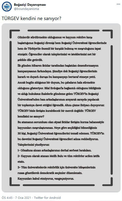 TÜRGEV'in Boğaziçi öğrencilerini temsil edecek bir merci olmadığı vurgulanan açıklamada, "TÜRGEV kendini ne sanıyor? Bu atamanın sorumlusu olan siyasal iktidar iletişim kurma bahanesiyle kayyumları meşrulaştıramaz" denildi.
