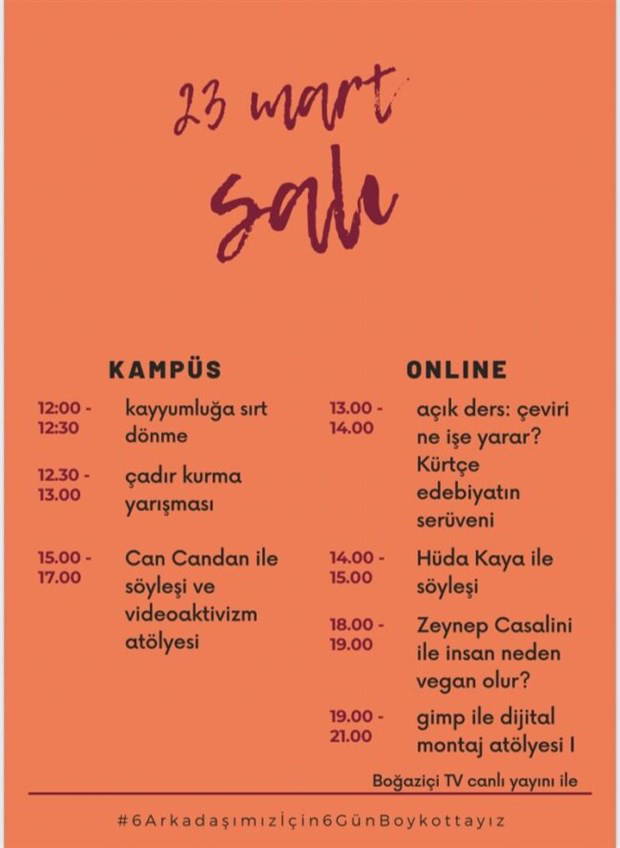 Boğaziçi öğrencileri dün tutuklu öğrencilerin serbest bırakılması talebiyle 6 günlük boykot başlattı. Tutuklu arkadaşları için bu hafta boykotta olacaklarını belirten öğrencilerin bugün boykotta ikinci günü.