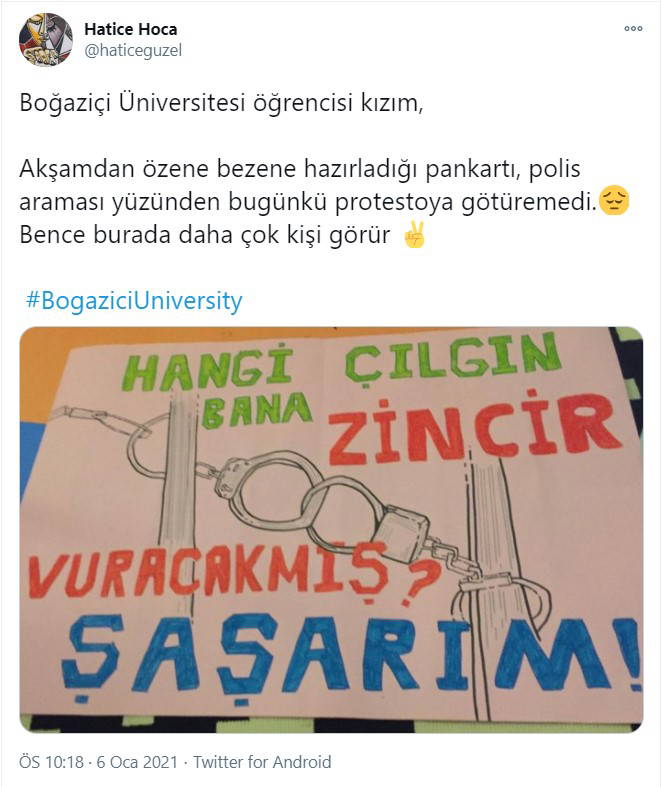 Boğaziçili bir öğrenci ise üniversite kapısına kelepçe vurulmasına gönderme yaptığı pankartını polis araması nedeniyle eyleme götüremedi. Bunun üzerine öğrencinin annesi söz konusu pankartı sosyal medyadan paylaşarak şu ifadelere yer verdi:
