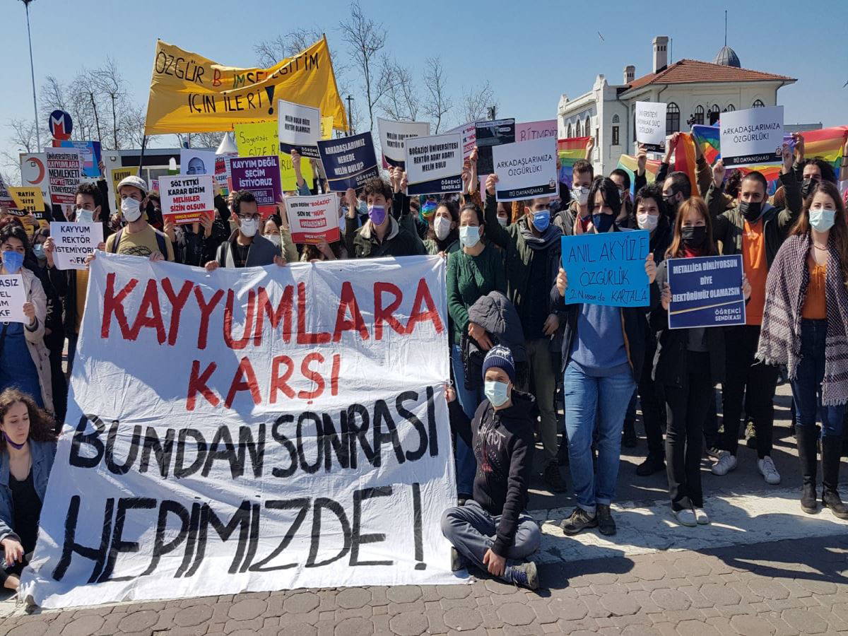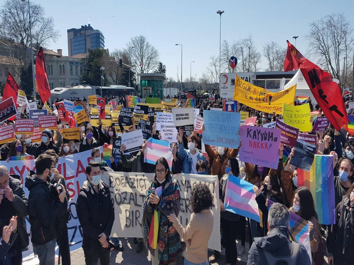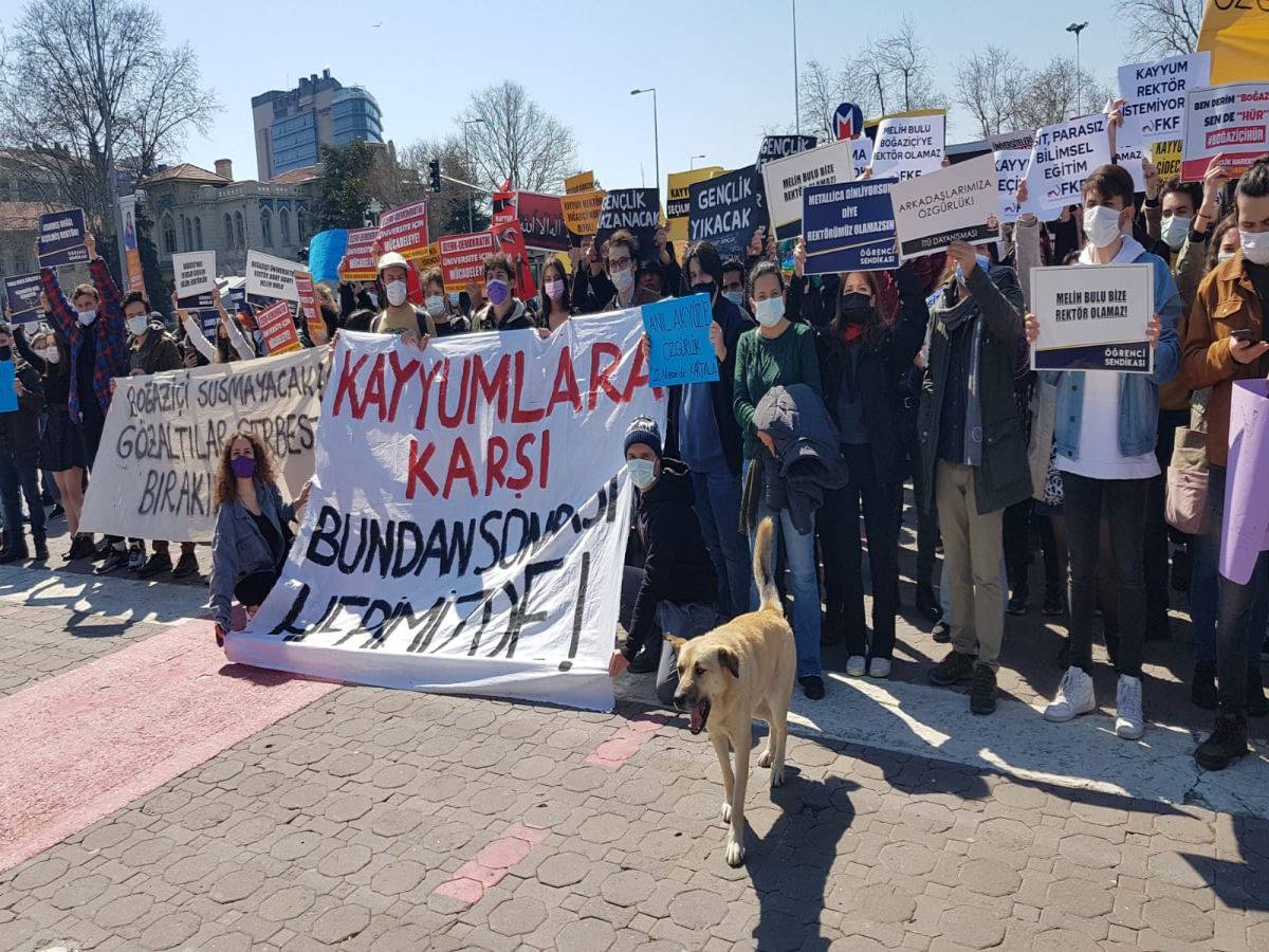 Alanda toplanan gençler, "Arkadaşlarımızı serbest bırakın" çağrısında bulunarak, "Kayyumlar gidecek biz kalacağız", "Her yer Boğaziçi her yer direniş", "Homofobik rektör istemiyoruz" sloganları attı.