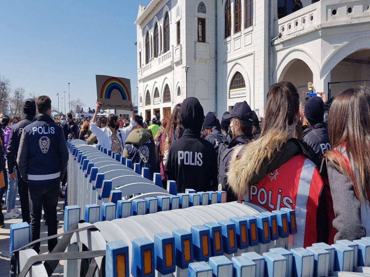 Eylemciler alana tek tek aranarak alınırken LGBTİ+ sembolü olan bayraklara ve üzerinde gökkuşağı bulunan pankartlara polisin el koyduğu görüldü.