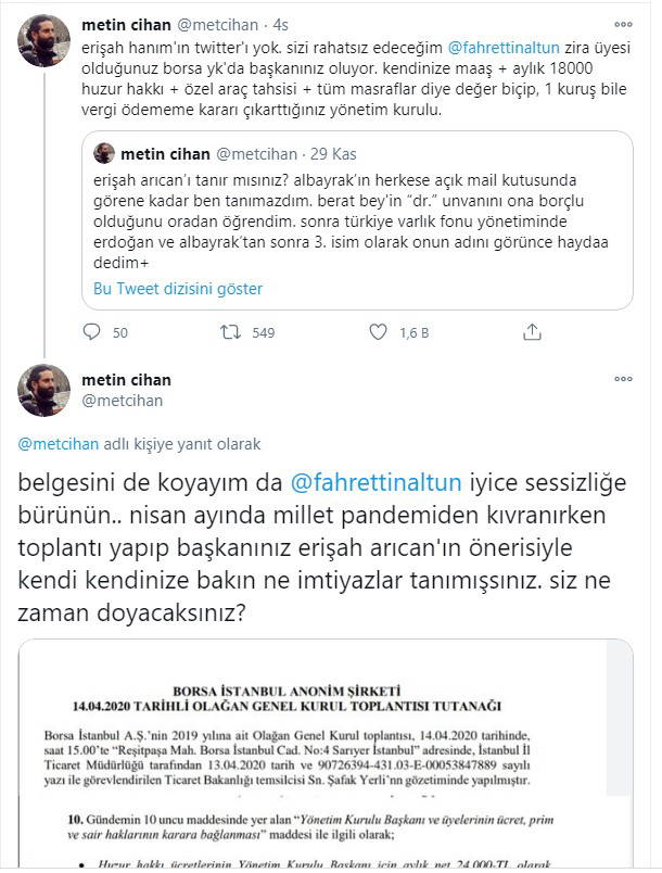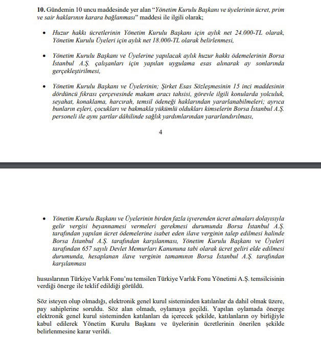 Kararlara göre, Yönetim Kurulu Başkanı Erişah Arıcan'a aylık 24 bin TL, aralarında Borsa İstanbul A.Ş Genel Müdürü Mehmet Hakan Atilla ve İletişim Başkanı Fahrettin Altun'un da bulunduğu yönetim kurulu üyelerine ise 18 bin TL huzur hakkı tanındı.