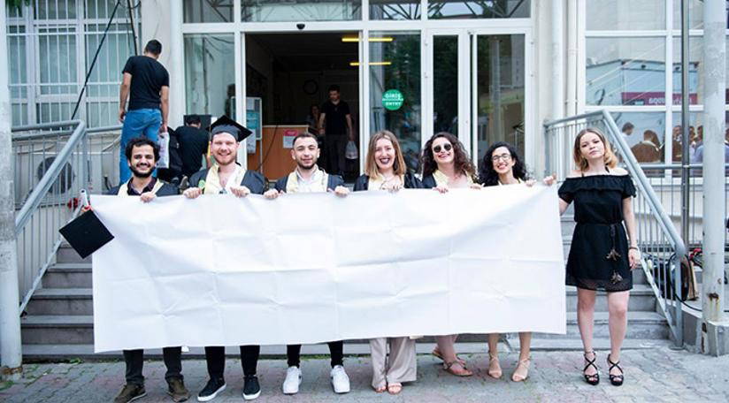 Mezuniyet töreninin başlangıcında el konulan pankart, tören sonrasında öğrencilere teslim edildi.