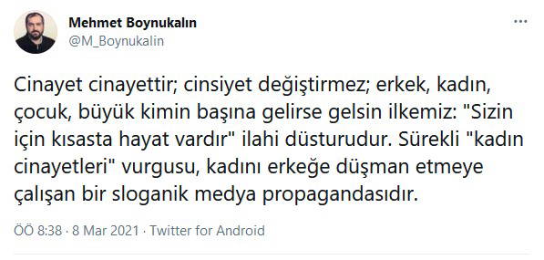 “1921 ve 24 anayasalarında devletin dini İslam’dı ve laiklik yoktu. Cumhuriyet fabrika ayarlarına dönsün” diyerek, Anayasa’dan laikliğin kaldırılması çağrısı yapan Mehmet Boynukalın bu kez de kadın cinayetleriyle ilgili skandal bir tweet attı.