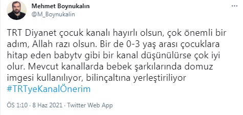 "TRT Diyanet Çocuk Kanalı" kurulması için TRT ile Diyanet İşleri arasında protokol imzalanmıştı. Bu karar için memnuniyetini "Çok önemli bir adım, Allah razı olsun" diyerek dile getiren Boynukalın, TRT'ye bir de 0-3 yaş arası çocuklar için kanal kurulması çağrısı yaptı.