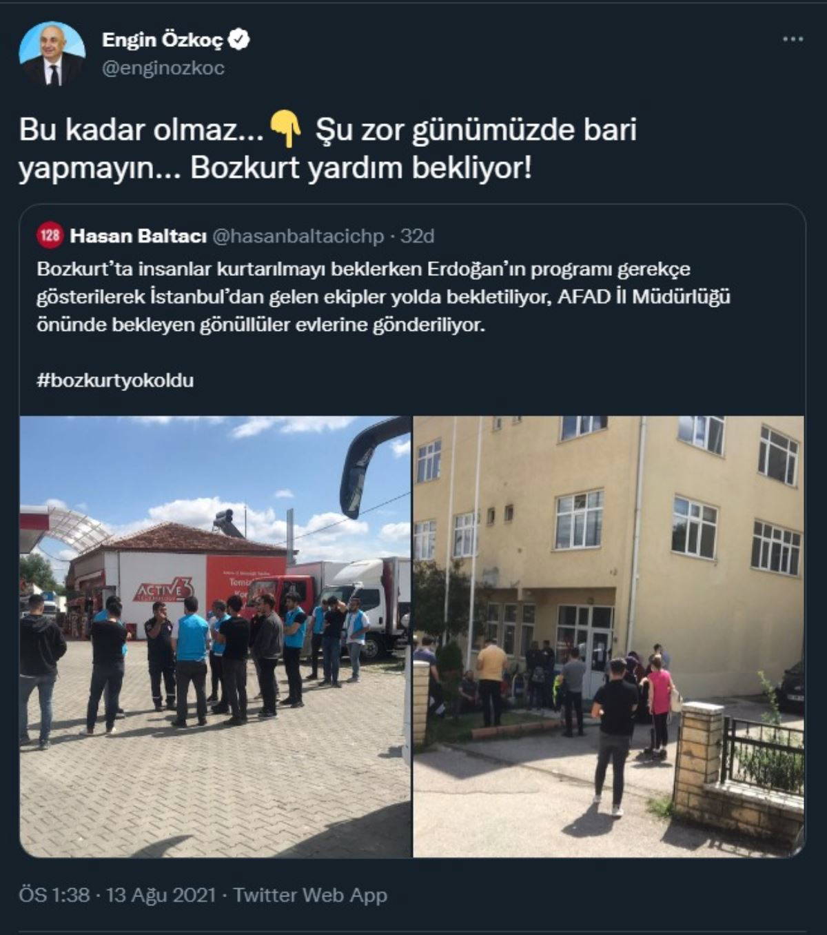 CHP'li Baltacı, sosyal medyadan görüntüleri paylaşarak, "Bozkurt’ta insanlar kurtarılmayı beklerken Erdoğan’ın programı gerekçe gösterilerek İstanbul’dan gelen ekipler yolda bekletiliyor, AFAD İl Müdürlüğü önünde bekleyen gönüllüler evlerine gönderiliyor" dedi.