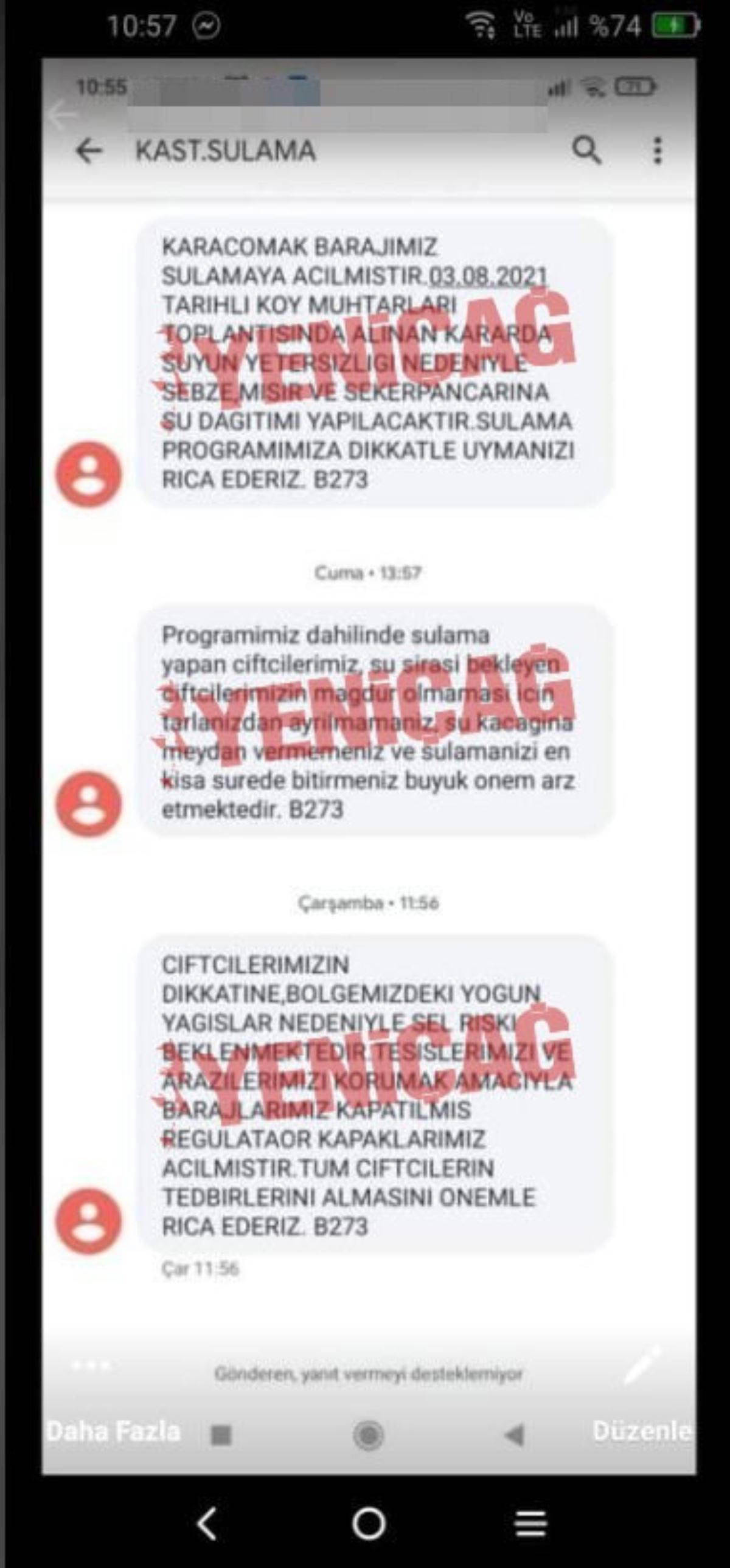 Mesajda, “Çiftçilerimizin dikkatine. Bölgemizdeki yoğun yağışlar nedeniyle sel riski beklenmektedir. Tesislerimizi ve arazilerimizi korumak amacıyla barajlarımız kapatılmış regulataör kapaklarımız açılmıştır. Tüm çiftçilerimizin önlem almasını önemle rica ederiz” denildiği görülüyor.