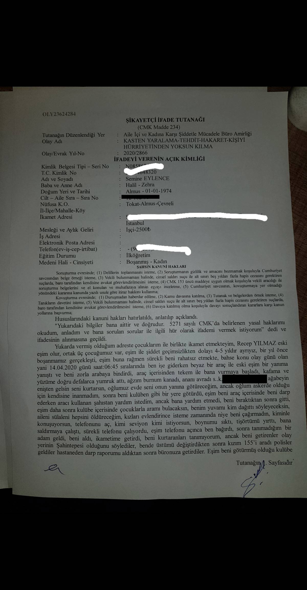 "Recep Yılmaz ile şiddetli geçimsizlik nedeniyle 4-5 yıldır ayrıyız. 1 yıl önce boşanmamız gerçekleşti. Eşim buna rağmen sürekli beni rahatsız etmekte. 14.04.2020 günü saat 06.45 sıralarında ben işe giderken beyaz bir araç ile eski eşim yanıma yaklaştı ve beni zorla arabaya bindirdi. Araç içerisinde bana vurmaya başladı. Sonra beni bir kulübeye götürdü. Burada bana, 'Çocuklarla aramı bulacaksın, benim yuvamı kim dağıttı söyleyeceksin, aileni sülaleni hepsini öldüreceğim' gibi şeyler söyledi. Boynumu sıktı, tişörtümü yırttı. Bana silah çekti, 'buradan ölün çıkar, seni öldürürüm' dedi. Daha sonra ben bağırdım. Tanımadığım bir kişi gelip beni kurtardı."