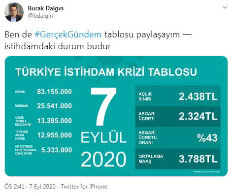 Tabloyu paylaşan Deva Partisi Genel Başkan Yardımcısı Burak Dalgın, açlık sınırının asgari ücretin üzerinde olduğunu, 5 milyon 300 binden fazla gencin ne eğitimde ne de istihdamda yer aldığını gösteren tabloyu paylaşırken "Ben de #GerçekGündem tablosu paylaşayım — istihdamdaki durum budur" ifadelerini kullandı.