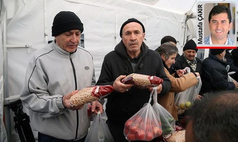 Ankara Sıhhıye’deki tanzim çadırına alışverişe gelenlerin neredeyse tamamı emekliler. Önce tanzim satış kuyruğuna, sonra da otobüs kuyruğuna giriyorlar. Emekliler, ücretsiz olduğu için belediye otobüslerini tercih ediyor; evlerine öyle dönüyorlar.