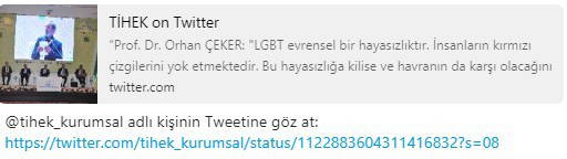 TİHEK, resmi Twitter hesabından sempozyumun konuşmacılarından ilahiyatçı Orhan Çeker'in LGBTİ bireylere yönelik ifadeleri paşlaştı. TİHEK'in paylaşımı şu şekilde: