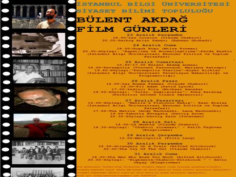 Bu yıl genç yaşta hayatını kaybeden Hacettepe Üniversitesi Felsefe bölümü mezunu, felsefe, satranç, fotoğraf çevrelerinin yakından tanıdığı eğitimci Dr. Bülent Akdağ için Bilgi Üniversitesi Dolapdere Kampüsü'nde 23-31 Aralık tarihleri arasında "Film Günleri" ve 25 Aralık Cumartesi günü de anma etkinliği düzenlendi. Bugün saat 18.00'de ünlü Fransız yönetmen Claude Chabrol'ün Les Cousins/Kuzenler filmiyle başlayacak Film Günleri’nde Akdağ'ın beğendiği, Sarhoş Atlar Zamanı, Matrix,Yedinci Kıta, Fil Adam, Tabutta Rövaşata gibi sinema tarihinin önemli yapıtları gösterilecek. Etkinlik boyunca, sinema ve felsefe alanından; Fatih Özgüven, Derviş Zaim, Sevin Okyay, Ferda Keskin, Alper Kırklar, Kaan Atalay, Suha Karataş söyleşilerle yapacaklar. 25 Aralık Cumartesi günü saat 10.00'da başlayacak anma töreni ise, Vincent Paronnaud, Marjane Satrapi'nin "Persepolis" filminin gösterimi ve Alper Kırklar'ın "Persepolis Üzerine" söyleşisi ile noktalanacak.