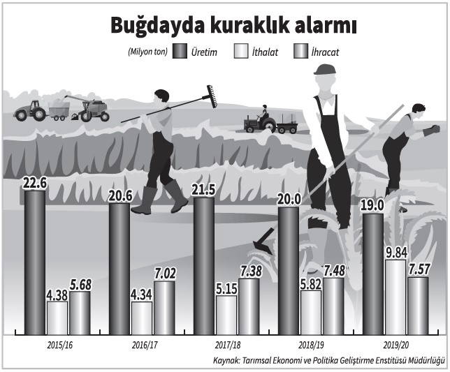 Türkiye’de bu yıl 19 milyon ton buğday rekoltesi beklenirken yeterli yağış olmaması nedeniyle rekoltenin 18 milyonun altına düşmesi bekleniyor. Bu da geçen yıla göre 1.5-2 milyon ton daha az üretim demek ve bugünlerde açıklanacak taban fiyatlar için önemli bir veri anlamına geliyor. Araştırmayı yapan TZOB’un başkanı Şemsi Bayraktar, kuraklıktan etkilenen üreticilerin ayakta kalabilmesi için desteklenmesi gerektiğini belirterek “Üreticilerimizin kredi borçları uzun vadeli faizsiz ertelenmelidir” diye konuştu.