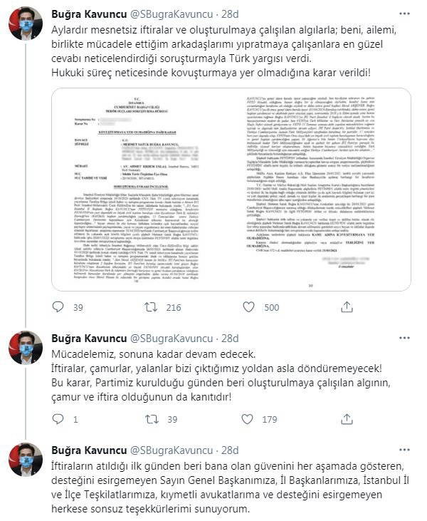 FETÖ'den soruşturma başlatılan İYİ Parti İstanbul İl Başkanı Buğra Kavuncu hakkında kovuşturmaya yer olmadığına karar verildi. Kararı Twitter hesabından duyuran Kavuncu, "Hukuki süreç neticesinde kovuşturmaya yer olmadığına karar verildi!" ifadelerini kullandı.