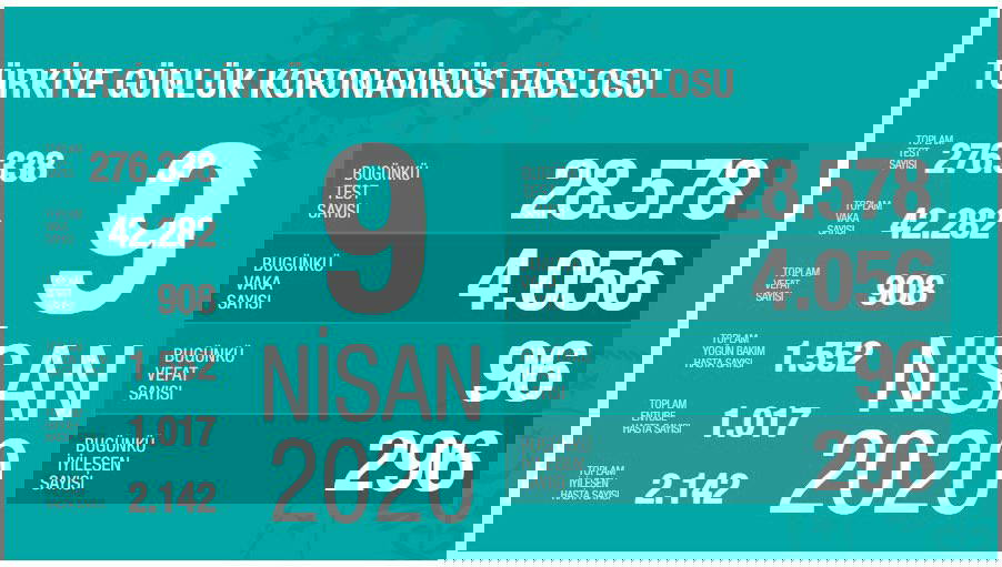 Sağlık Bakanı Fahrettin Koca'nın açıkladığı yeni bilgilere göre, Türkiye'de 96 yurttaş daha koronavirüs nedeniyle yaşamını yitirdi. Bugün tespit edilen 4 bin 56 yeni vakayla birlikte Türkiye'deki toplam koronavirüs vaka sayısı 42 bin 282'ye yükselmiş oldu. Türkiye'de koronavirüs nedeniyle yaşamını yitirenlerin toplam sayısı 908'e ulaşırken bin 552 yurttaş dayoğun bakımda edavi görür.