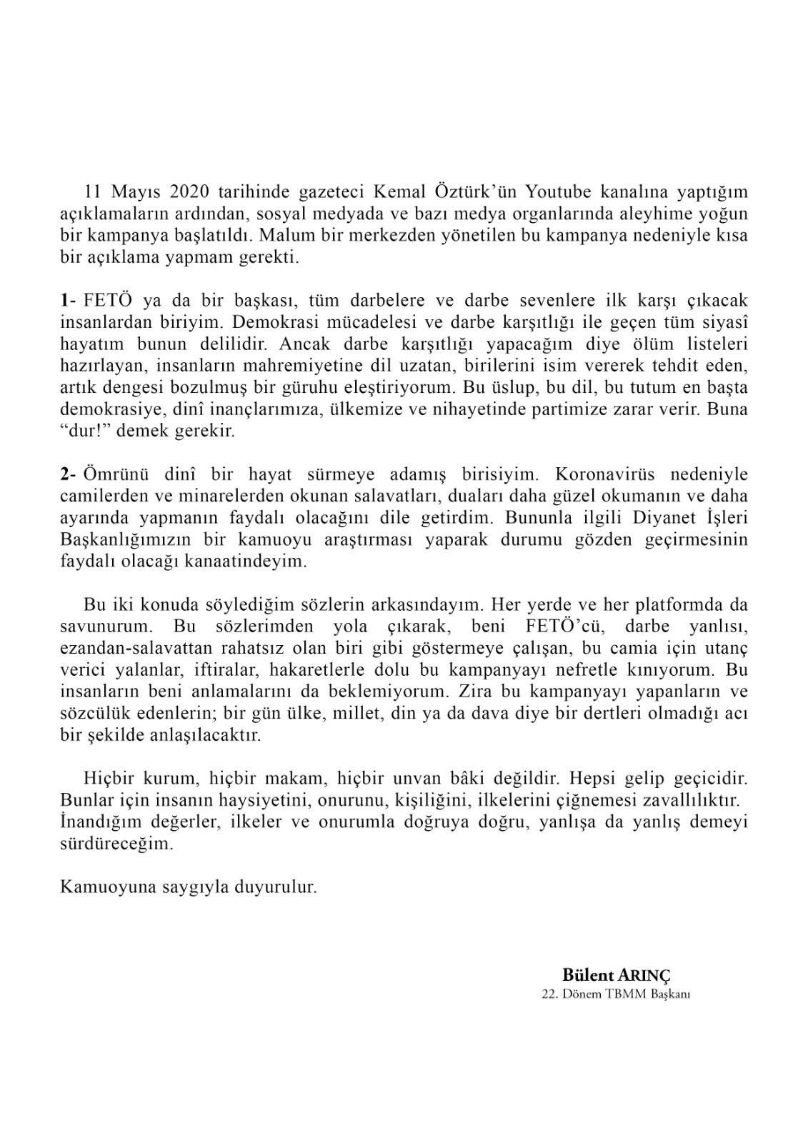 "11 Mayıs 2020 tarihinde Kemal Öztürk'ün Youtube kanalına yaptığım açıklamaların ardından, sosyal medyada ve bazı medya organlarında aleyhime yoğun bir kampanya başlatıldı. Malum bir merkezden yönetilen bu kampanya nedeniyle kısa bir açıklama yapmam gerekti. FETÖ ya da bir başkası, tüm darbelere ve darbe sevenlere karşı çıkacak insanlardan biriyim. Demokrasi mücadelesi ve darbe karşıtlığı ile geçen tüm siyasi hayatım bunun delilidir. Ancak darbe karşıtlığı yapacağım diye ölüm listeleri hazırlayan, insanların mahremiyetine dil uzatan, birilerini isim vererek tedhit eden, artık dengesi bozulmuş bir güruhu eleştiriyorum. Bu üslup, bu dil, bu tutum en başta demokrasiye , dinin inançlarımıza, ülkemize ve nihayatinde partimize zarar verir. Buna dur demek gerekir. Ömrünü dini bir hayat sürmeye adamış birisiyim. Koronavirüs nedeniyle camilerden ve minarelerden okunan salavatalrı, duaları daha güzel okumanın ve ayarında yapmanın faydalı olacağını dile getirdim. Bununla ilgili Diyanet İşleri Başkanlığımızın bir kamuoyu araştırması yaparak durumu gözden geçirmesinin faydalı olacağı kanaatindeyim.