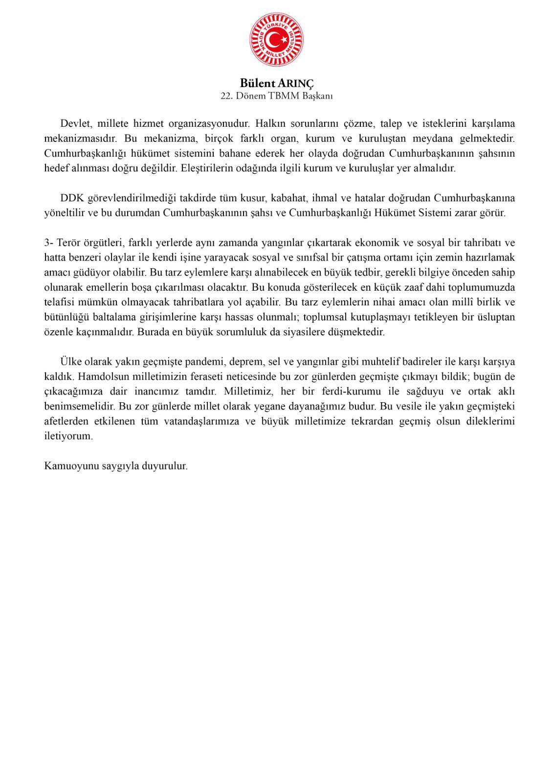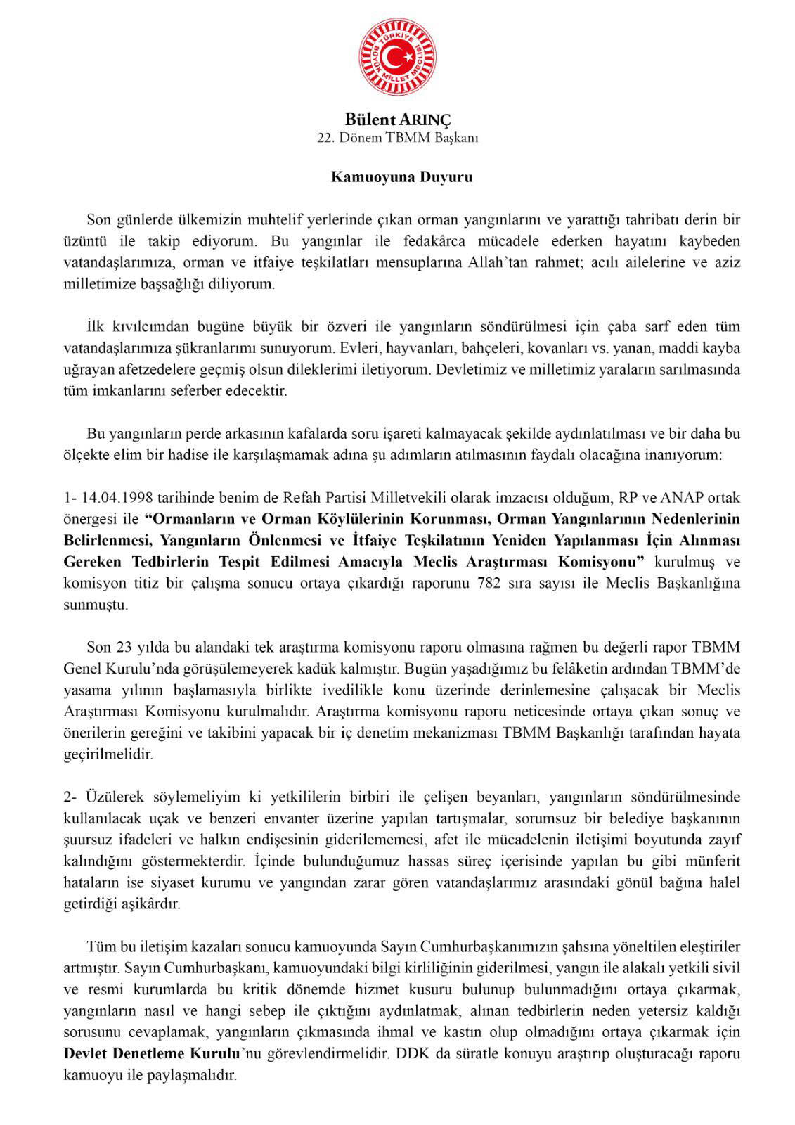 Arınç, 'Kamuoyuna Duyuru' başlığıyla yayımladığı yazısında "Yangınlar kafalarda soru işareti kalmayacak şekilde aydınlatılmalıdır" çağrısında bulundu.
