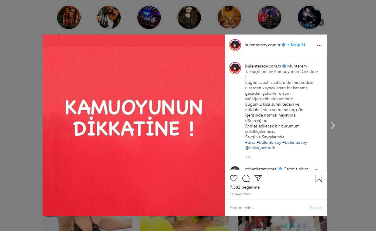 Sosyal medya hesabından açıklama yapan Ersoy, "Bugün sabah saatlerinde midemdeki ülserden kaynaklanan bir kanama geçirdim. Şükürler olsun, sağlığım, sıhhatim yerinde. Bugünkü kısa süreli tedavi ve müdahalen sonra birkaç gün içerisinde normal hayatıma döneceğim. Endişe edilecek bir durumum yok. Bilgilerinize. Sevgi ve saygılarımla" dedi.