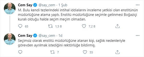 Twitter hesabından önceki gün duyuran Say, "Melih Bulu kendi tezlerindeki intihal iddialarını inceleme yetkisi olan enstitünün müdürlüğüne atama yaptı. Enstitü müdürlüğüne seçimle gelinmesi Boğaziçi kuralı olduğu halde seçim meçim olmadan" ifadelerini kullandı.