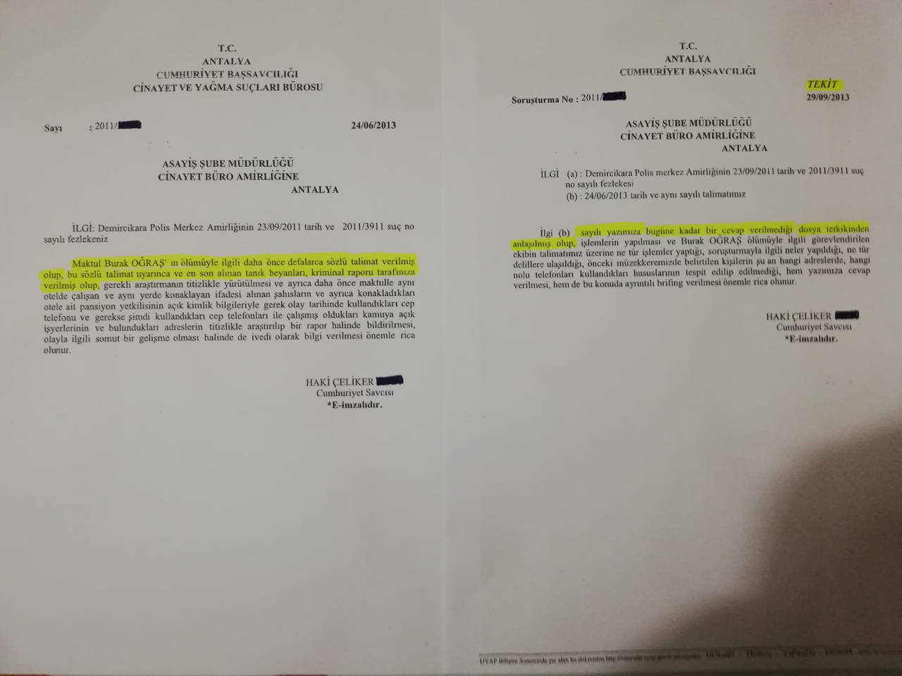 Baba Oğraş'ın soruşturmayı yürüten savcının kendisine söylediğini iddia ettiği sözleri doğrulayan ise, savcı Haki Çelikler'in, 24 Haziran 2013 ve 29 Eylül 2013'te Asayiş Şube Müdürlüğü Cinayet Büro Amirliği'ne yazdığı yazılar oldu. Savcı Çeliker, 24 Haziran 2013'te Cinayet Büro'ya, defalarca sözlü talimat verdiğini ve talimat uyarınca araştırmanın titizlikle yürütülmesi gerektiği belirterek, kendisine hızlı bir şekilde rapor sunulması ve bilgi verilmesini istedi.