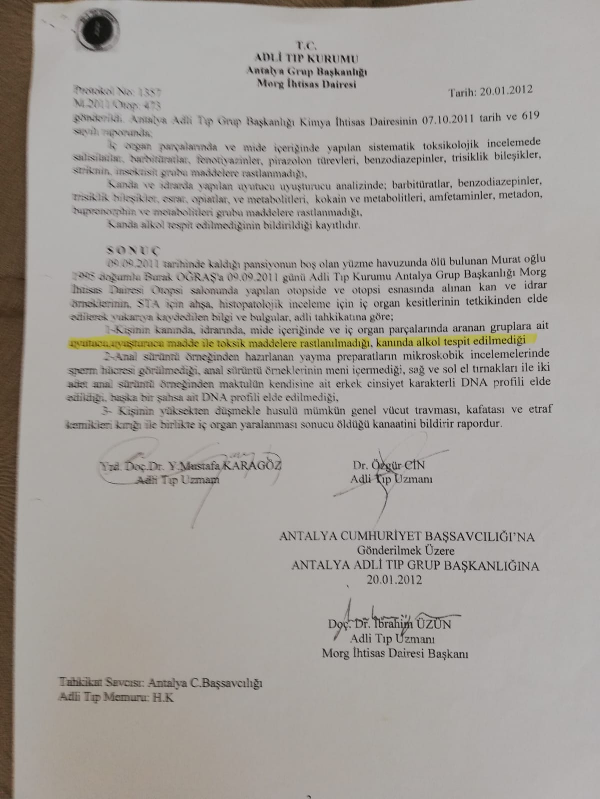 Olaydan yaklaşık 4 buçuk ay sonra hazırlanan otopsi raporuna göre ise, Burak'ın kanında, idrarında, iç organ parçalarında ve mide içeriğinde herhangi bir alkol ya da uyuşturucu örneğine rastlanmadığı, iki elinin tırnakları ve anal sürüntü örneklerinde başkasına ait DNA profili elde edilmediği ve ölüm nedeninin yüksekten düşmeye bağlı vücut travması, kafatası ve etraf kemikleri kırığı ile birlikte iç organ yaralanması olduğu belirtildi. (YUKARIDA)