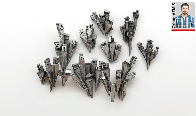 Sergiye ismini veren “Alem-i Mülk” sergideki en büyük eser, tam 460 kilo. Karakaya, kendi standartlarına göre hafif bir eser olduğunu söylüyor, başka zamanlarda tonlarca ağırlıkta eserler üretmiş. Temeli gerçek anlamda “insan” olarak betimlenmiş dikey bir kent yapılanması şeklinde “Alem-i Mülk”. Eser, insanın yaşam alanı oluşturmak için dikey kentler inşa ederken doğayı unutmasına değiniyor. İlk katta duvarlarda kayalıklar üzerindeki eski kral mezarları yer alıyor. Bir de Karakaya’nın eski Osmanlı mezarlıklarından esinlendiği eserler mevcut. Bu kattaki heykeller kurşun ve alüminyum gibi metal malzemelerden.