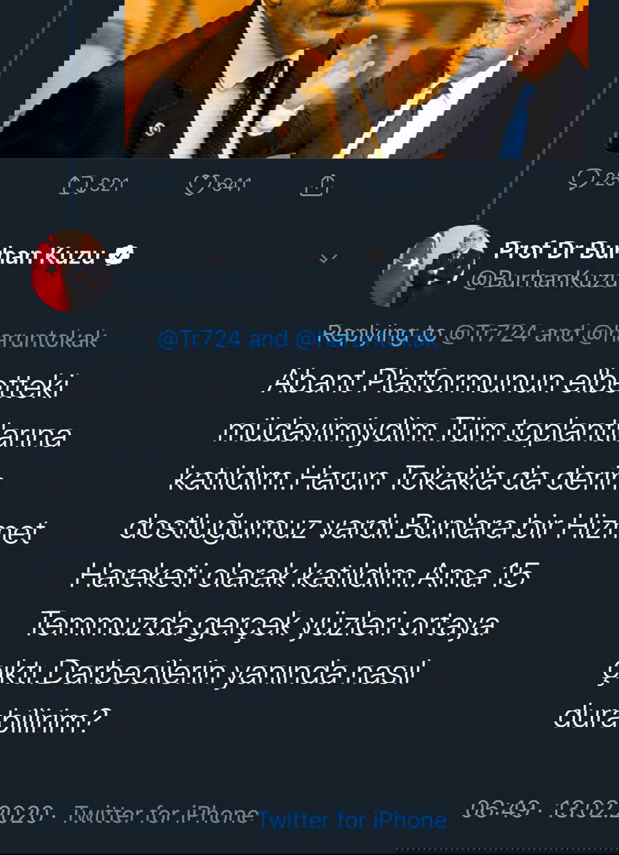 Twitter hesabından paylaşım yapan Kuzu, FETÖ organizasyonu olan Abant toplantılarının “müdavimi” olduğunu kabul ederek, “Abant Platformunun elbette ki müdavimiydim. Tüm toplantılarına katıldım. Harun Tokak’la da derin dostluğumuz vardı. Bunlara bir Hizmet Hareketi olarak katıldım. Ama 15 Temmuzda gerçek yüzleri ortaya çıktı. Darbecilerin yanında nasıl durabilirim?” ifadelerini kullandı.