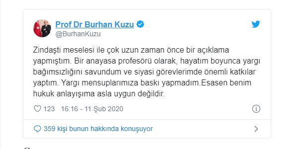 Yargı mensuplarına baskı yapmadığını söyleyen Kuzu, “Zindaşti meselesi ile çok uzun zaman önce bir açıklama yapmıştım. Bir anayasa profesörü olarak, hayatım boyunca yargı bağımsızlığını savundum ve siyasi görevlerimde önemli katkılar yaptım. Yargı mensuplarımıza baskı yapmadım. Esasen benim hukuk anlayışıma asla uygun değildir.”