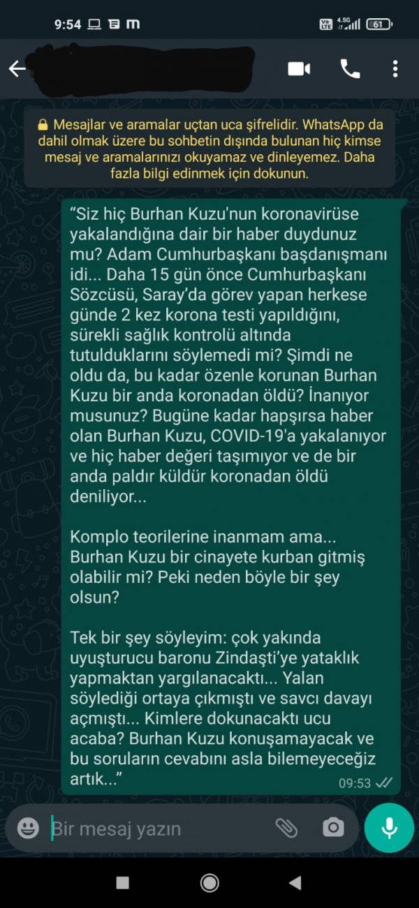 “Siz hiç Burhan Kuzu'nun koronavirüse yakalandığına dair bir haber duydunuz mu? Adam Cumhurbaşkanı başdanışmanı idi... Daha 15 gün önce Cumhurbaşkanı Sözcüsü, Saray’da görev yapan herkese günde 2 kez korona testi yapıldığını, sürekli sağlık kontrolü altında tutulduklarını söylemedi mi? Şimdi ne oldu da, bu kadar özenle korunan Burhan Kuzu bir anda koronadan öldü? İnanıyor musunuz? Bugüne kadar hapşırsa haber olan Burhan Kuzu, COVID-19'a yakalanıyor ve hiç haber değeri taşımıyor ve de bir anda paldır küldür koronadan öldü deniliyor...