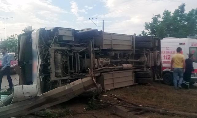 Bursa'da, kontrolden çıkan servis midibüsü, refüjdeki direğe çarparak devrildi. Kazada, sürücünün de aralarında olduğu 10 kişi yaralandı.