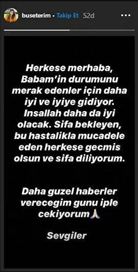 Buse Terim Bahçekapılı, babasının durumunun iyiye gittiğini belirtti.Buse Terim Bahçekapılı, Instagram hesabının hikaye bölümünden paylaştığı mesajda, şu ifadeleri kullandı: