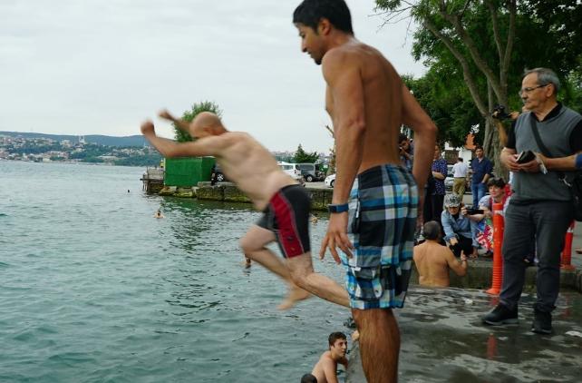 açıklanmasının ardından sloganlarla denize atladı.