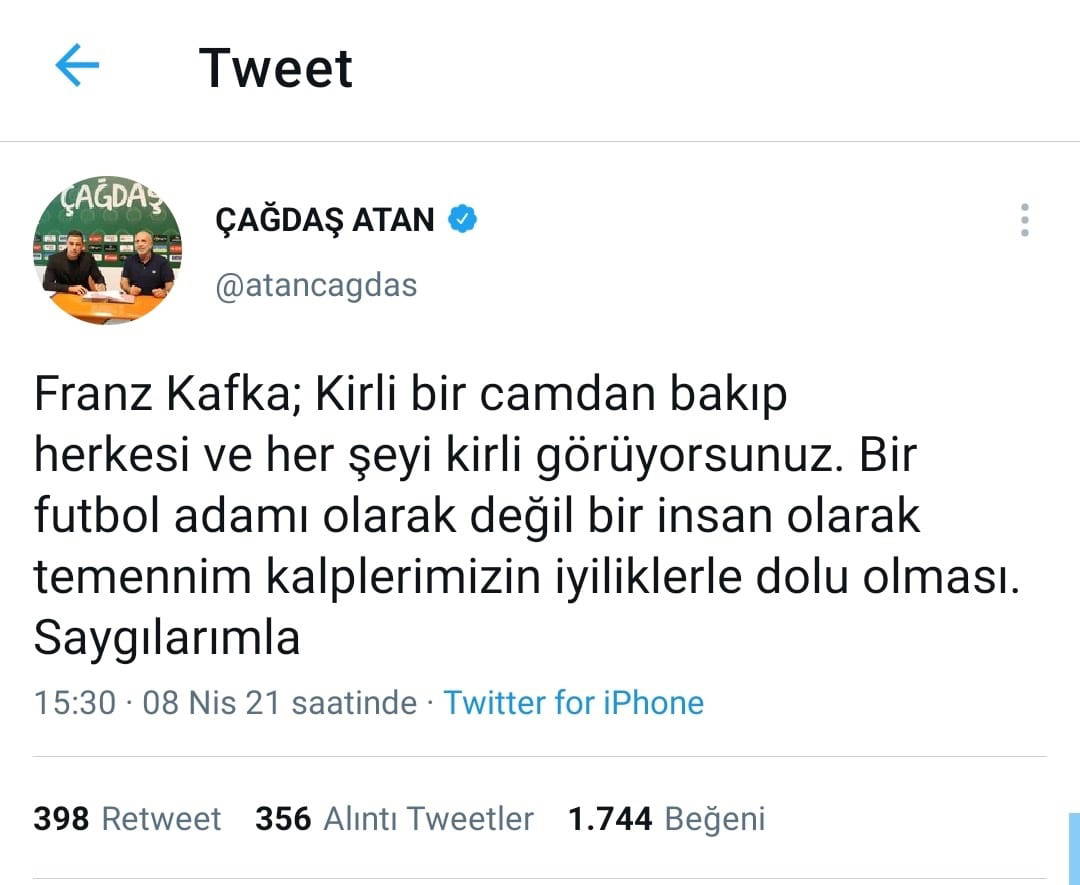 Süper Lig'de dün Beşiktaş'ın 3-0 üstünlüğüyle sona eren maçın ardından çeşitli eleştirilere maruz kalan Aytemiz Alanyaspor Teknik Direktörü Çağdaş Atan, sosyal medyadan paylaşımıyla eleştirilere yanıt verdi. Çağdaş Atan, paylaşımında, "Franz Kafka; Kirli bir camdan bakıp herkesi ve her şeyi kirli görüyorsunuz. Bir futbol adamı olarak değil bir insan olarak temennim kalplerimizin iyiliklerle dolu olması. Saygılarımla" dedi.
